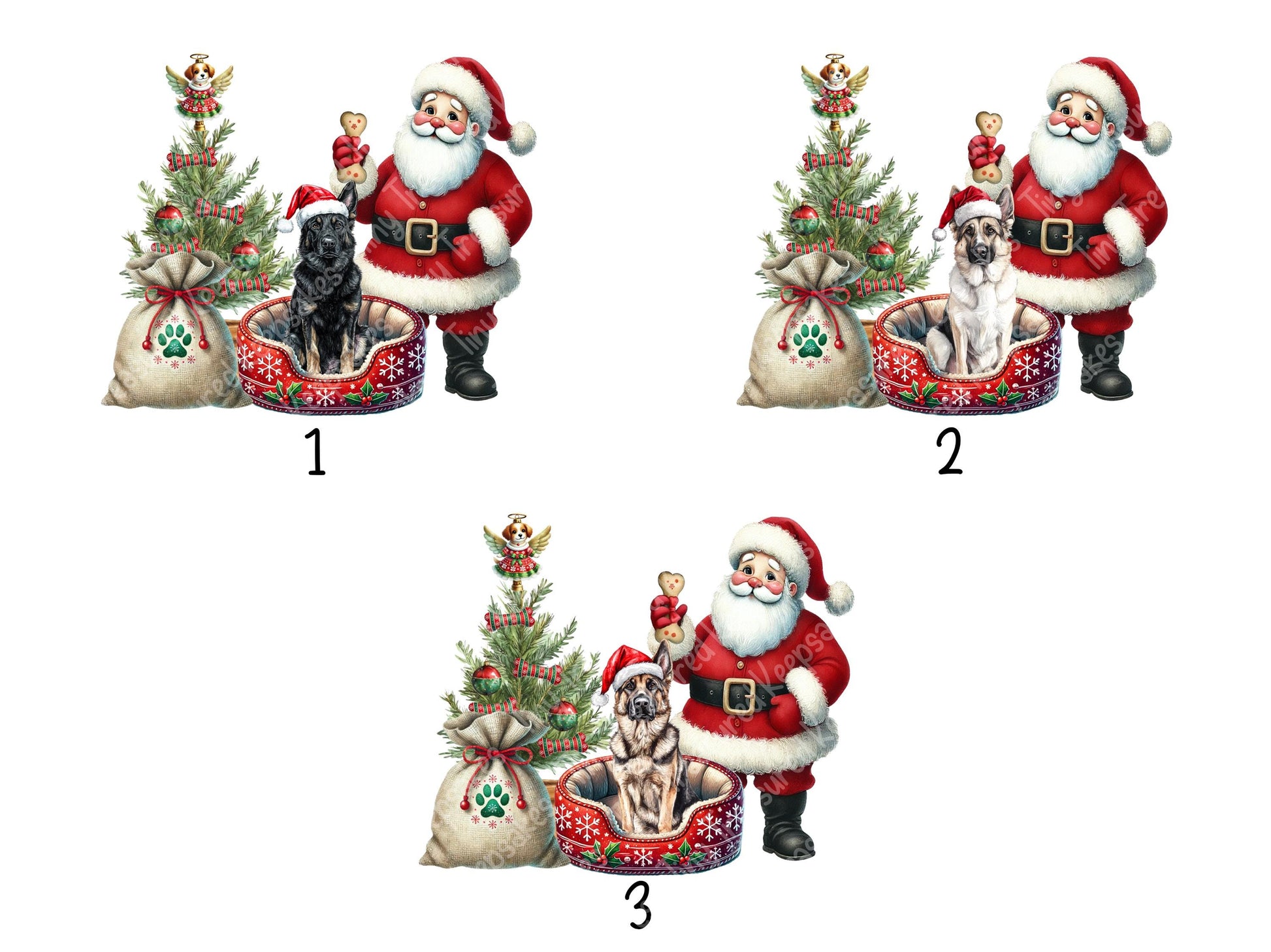 This personalised German Shepherd-Alsatian Christmas Christmas ornament is the perfect festive addition to your tree or a thoughtful gift for dog lovers. Each decoration features an adorable German Shepherd-Alsatian beside Santa and a Christmas tree, finished with a red ribbon for easy hanging.