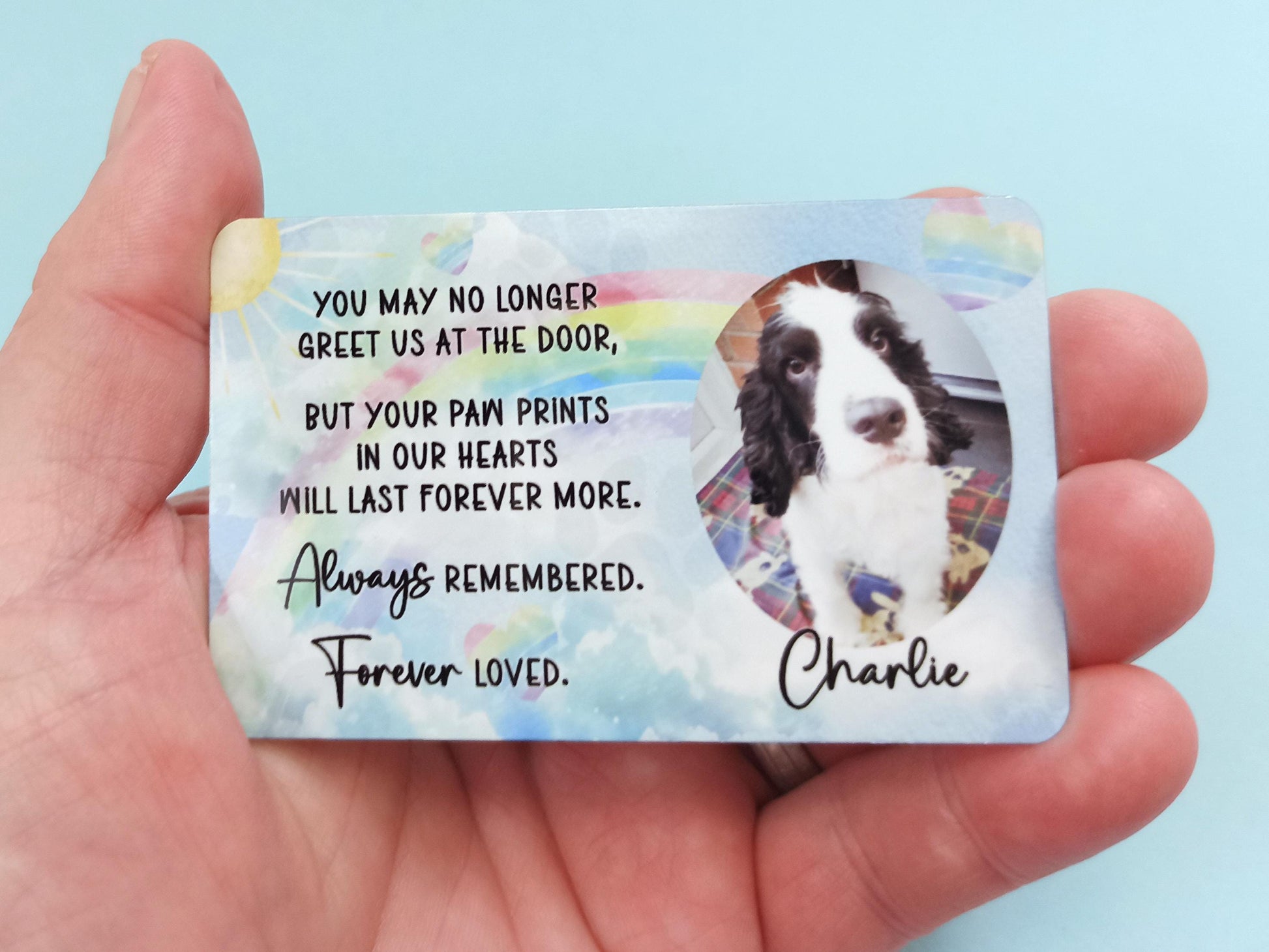 Crafted with care and designed to fit perfectly in any wallet, this custom keepsake features your dog’s photo, name, and a heartfelt message – so their memory stays with you wherever you go.