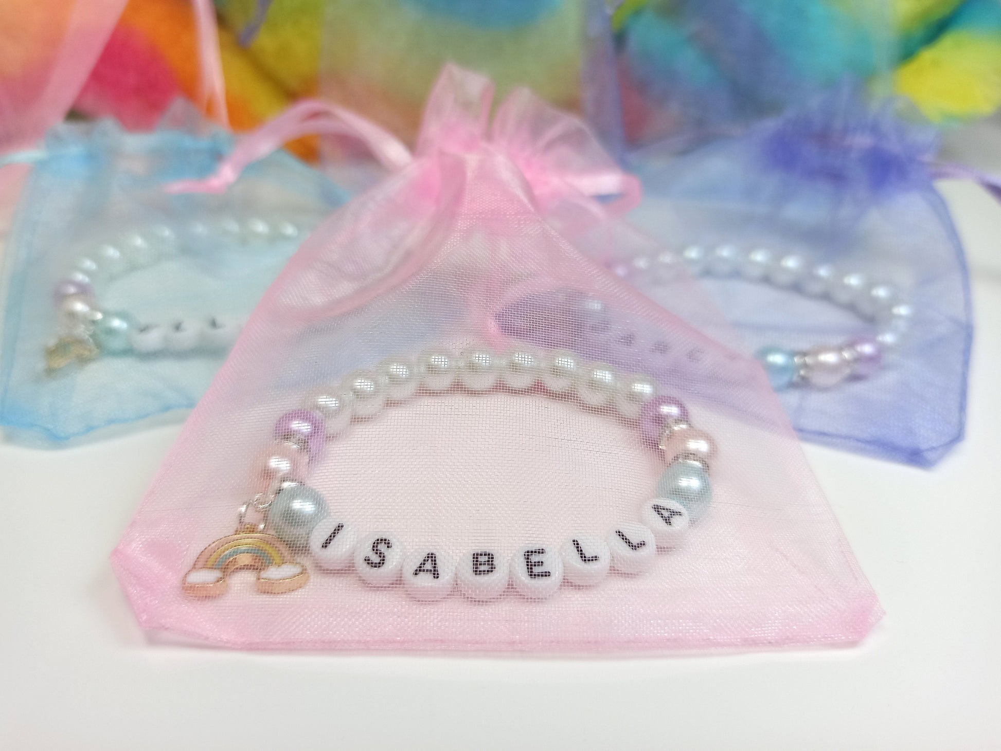 Each bracelet is made to order using faux glass pearl beads, sparkly rhinestone beads and acrylic letter beads. The majority of the bracelet will be made in white beads, along with some beautiful pastel beads on each side of their name. (Baby Blue, Pink and Lilac).