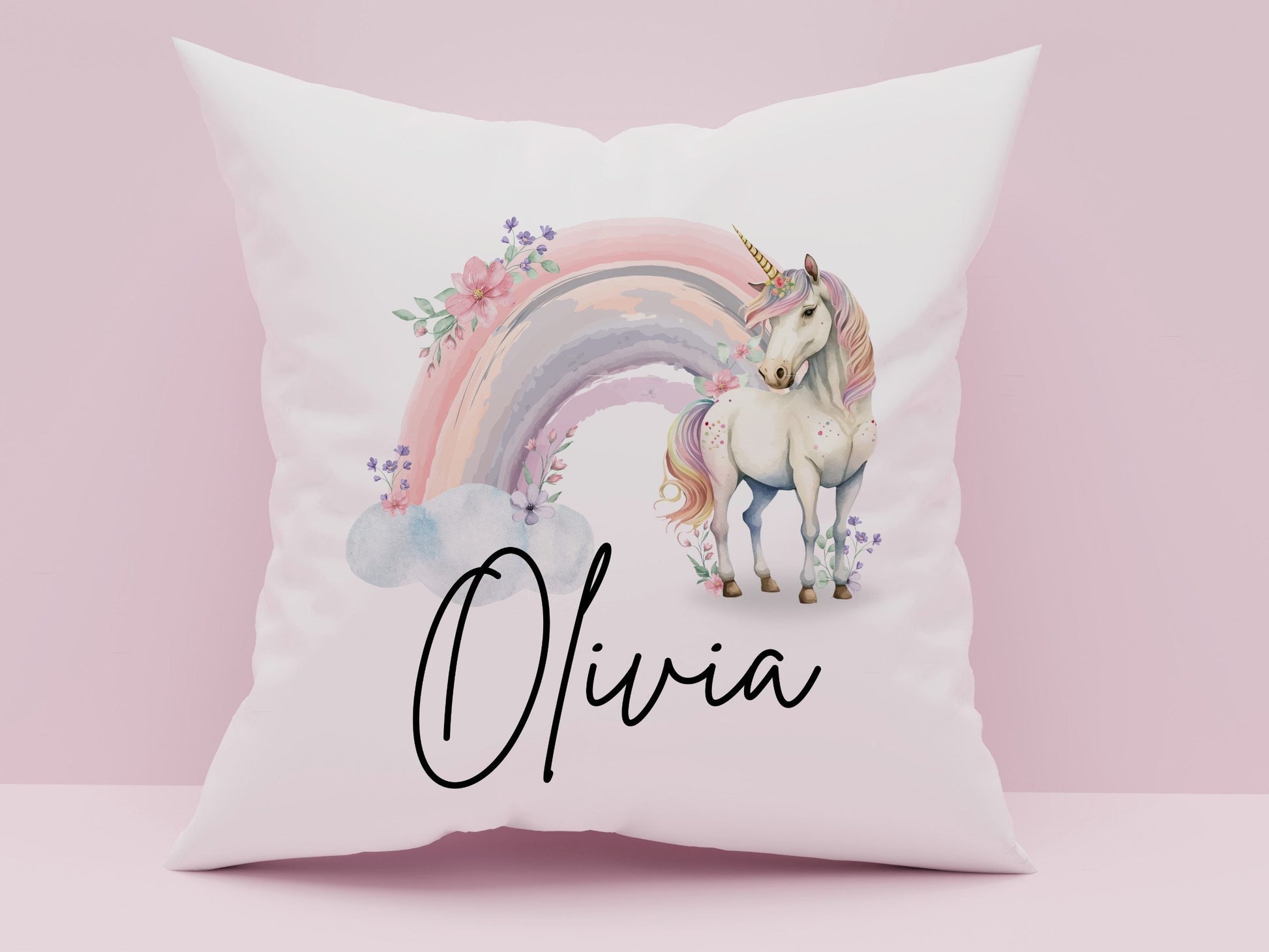 Super soft cushion in microfibre polyester. A lovely natural white/ivory shade cushion which will be printed with the unicorn illustration and personalised with the name of your choice.